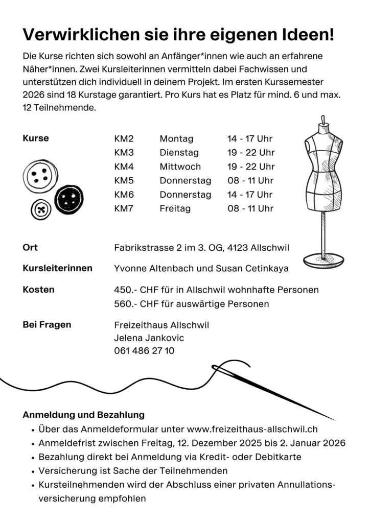 Die Kurse richten sich sowohl an Anfänger*innen wie auch an erfahrene Näher*innen. Zwei Kursleiterinnen vermitteln dabei Fachwissen und unterstützen dich individuell in deinem Projekt. Im ersten Kurssemester 2026 sind 18 Kurstage garantiert. Pro Kurs hat es Platz für mind. 6 und max. 12 Teilnehmende.
