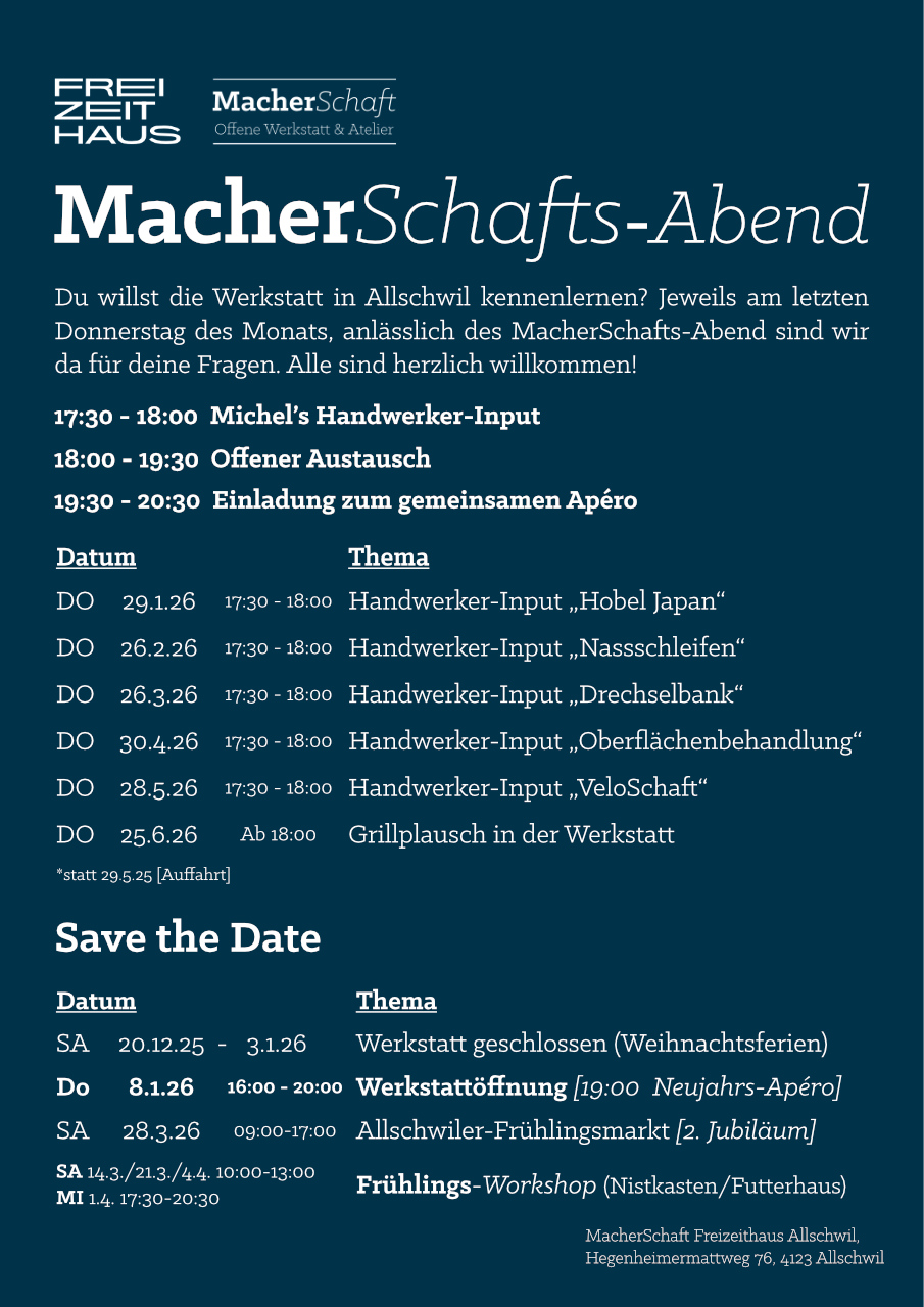 - Und ab 19.30 Uhr gibt es für alle die Lust haben etwas zu Essen (nicht immer, aber fast immer), um den Abend gemeinsam in der Werkstatt oder draussen an der Feuerschale bei einem Bier gemütlichen ausklingen zu lassen.