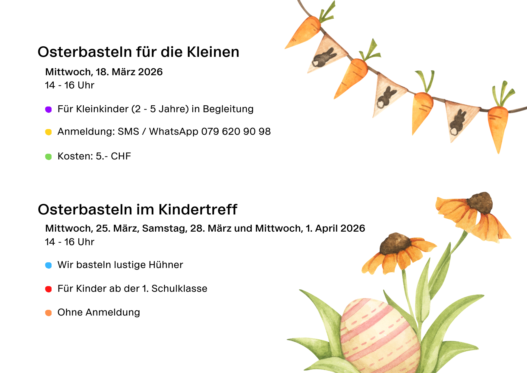 Das Osterbasteln findet dieses Jahr am Mittwoch, 25. März, Samstag, 28. März und Mittwoch, 1. April 2026 statt. Alle Termine findest du in der Agenda.