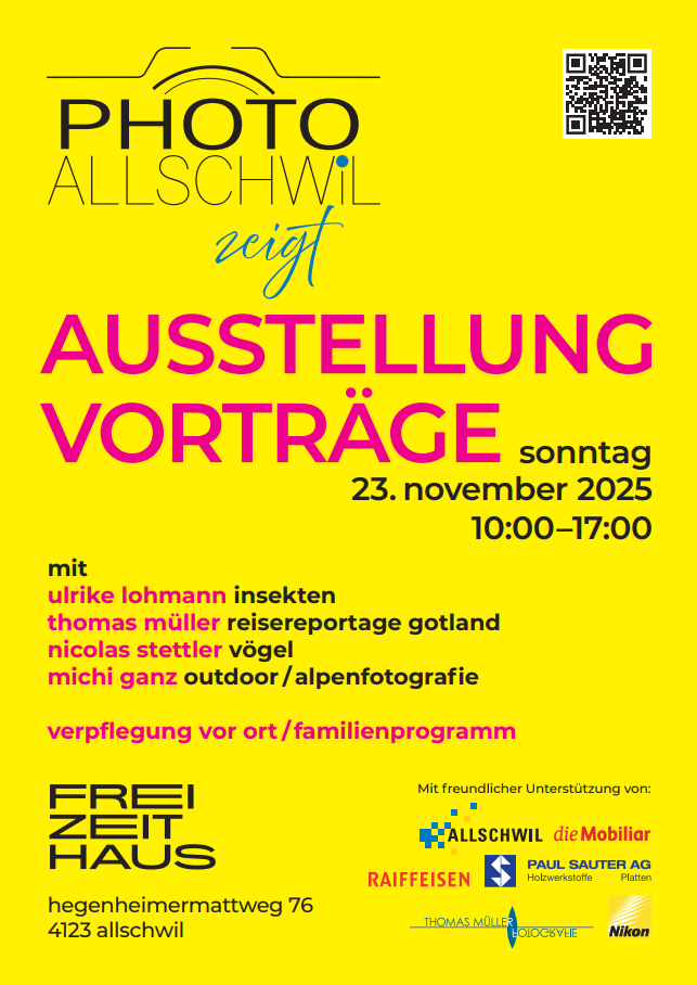 Der Verein PhotoAllschwil lädt zur Fotoausstellung „PhotoAllschwil zeigt…“ ins Freizeithaus Allschwil ein. Von 10.00 bis 17.00 Uhr können Besuchende vielfältige Fotografien von Vereinsmitgliedern sowie ausgewählte Arbeiten von Berufsfotograf*innen entdecken. Begleitend dazu finden um 10.30 Uhr, 12.30 Uhr und 14.00 Uhr spannende Workshops statt.